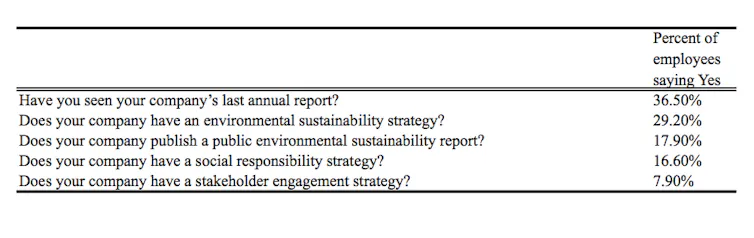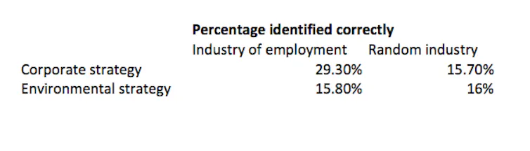 Overall, we found that only 29.3% of employees could correctly match their company to its publicly espoused strategy. 70% of employees could not identify the publicly presented corporate strategy of their employer. When we look at the environmental strategy of the firm, the numbers are even worse.